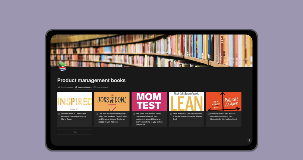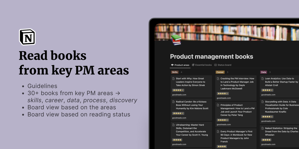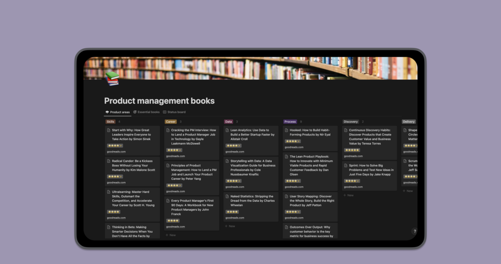 - 30+ books from key PM areas → skills, career, data, process, discovery, delivery, customers, product strategy, collaboration, experimentation, etc.
